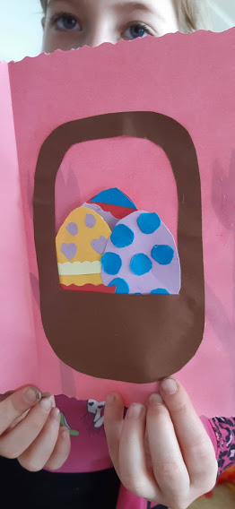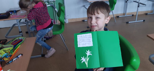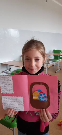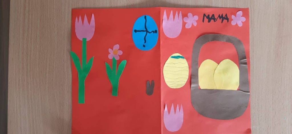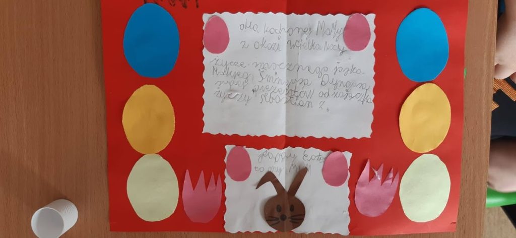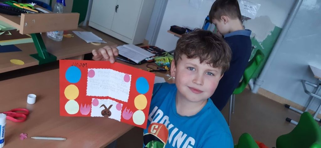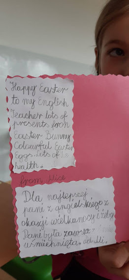 Kartki wielkanocne w języku angielskim. W czasie zdalnej nauki część uczniów uczyło się ze szkoły. W czasie zajęć wykonali kartki świateczne w j. angielskim.