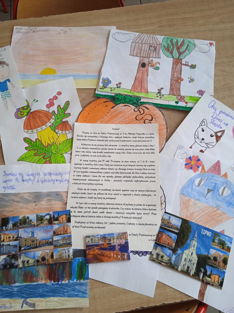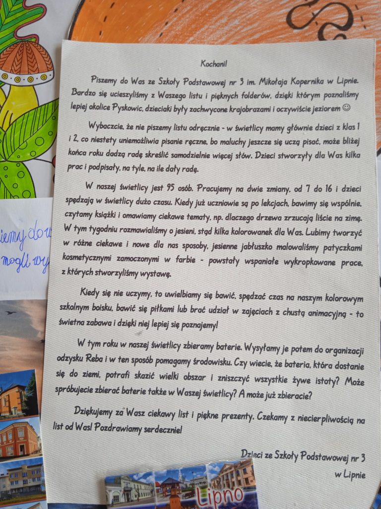 Otrzymaliśmy list od naszych kolegów i koleżanek z Lipna. Do listu były dołączone kartki pocztowe z miejscowości, prace plastyczne i pomysły na zajęcia świetlicowe. Dziękujemy! Niedługo odpiszemy!