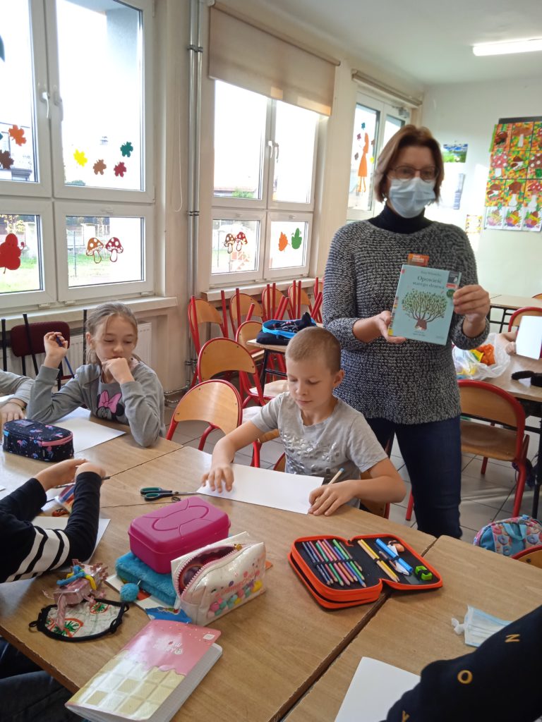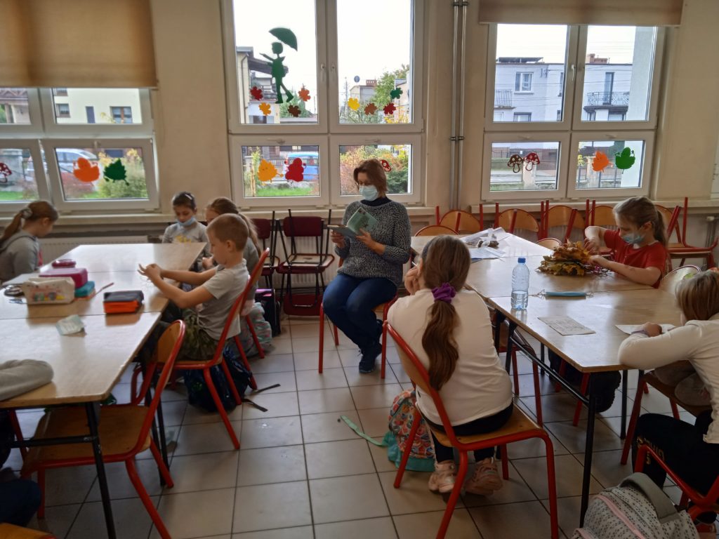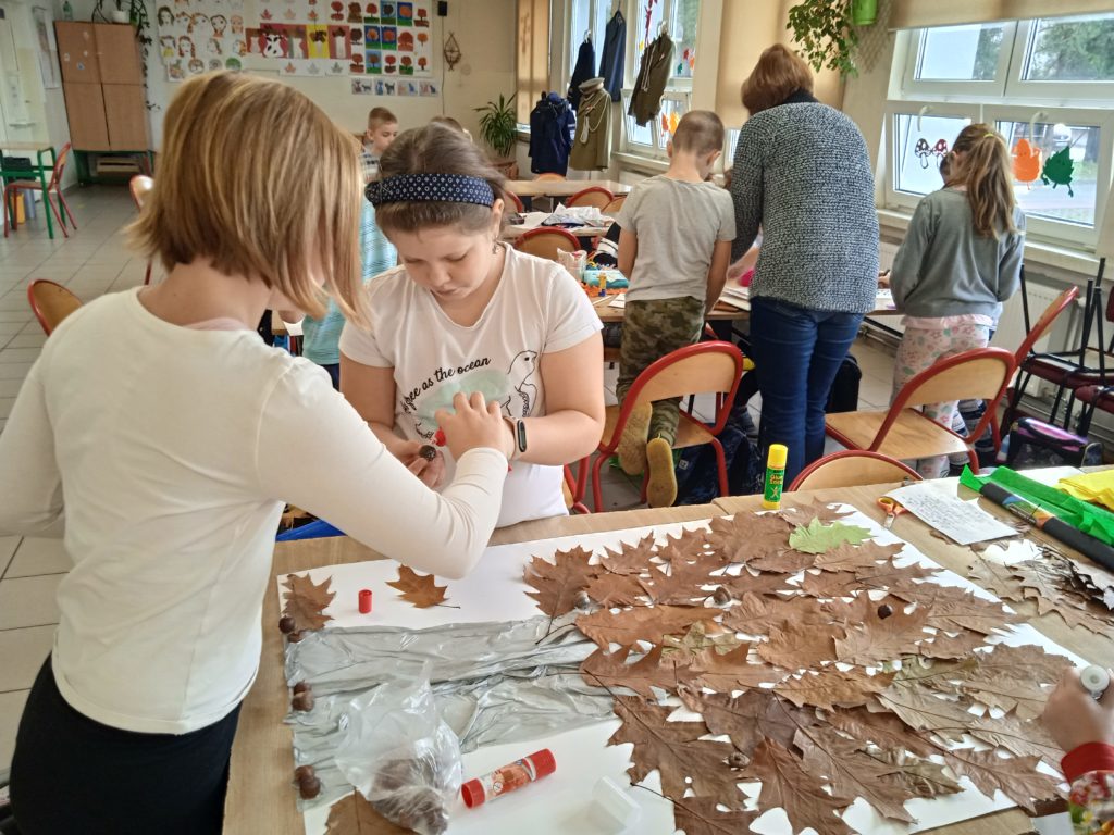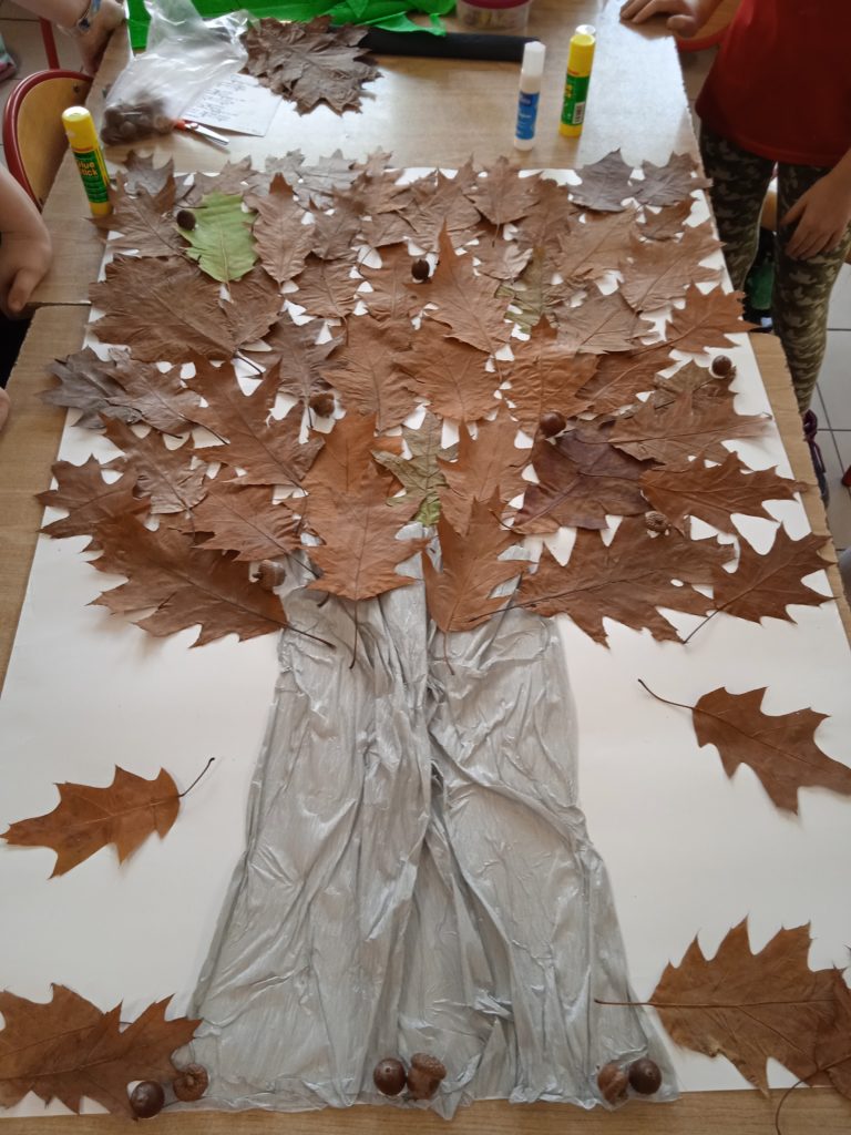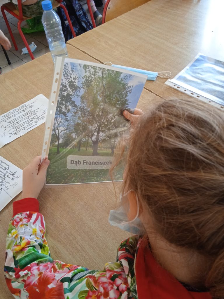 Uczniowie wysłuchali fragmentów „Opowieść starego dębu”, następnie wykonali prace plastyczną. Powstała również praca grupowa z suszonych liści. Na koniec wykonali również legitymację dębów.