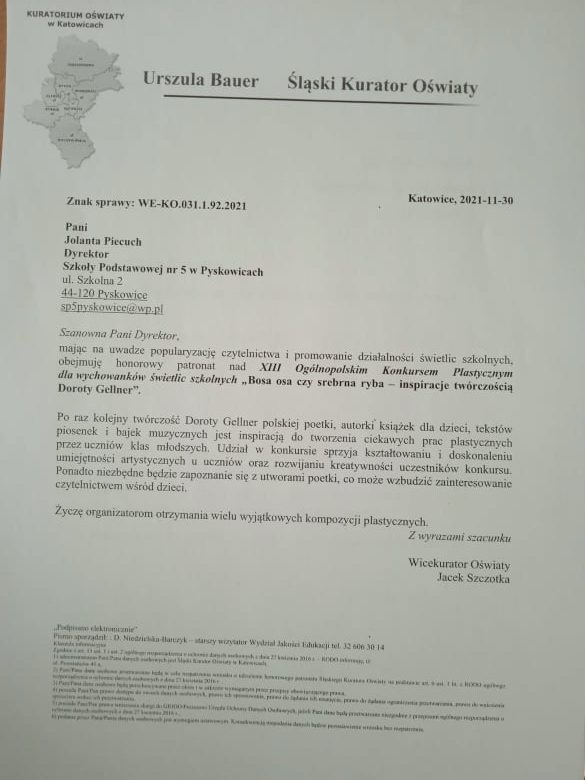 Dodatkowo zwróciliśmy się do Śląskiego Kuratora Oświaty o patronat nad konkursem. Kurator obejmuje swoją pieczą konkursy o randze ogólnopolskiej mające walory edukacyjne. Mamy informacje, że również Śląski Kurator Oświaty przyjął patronat.