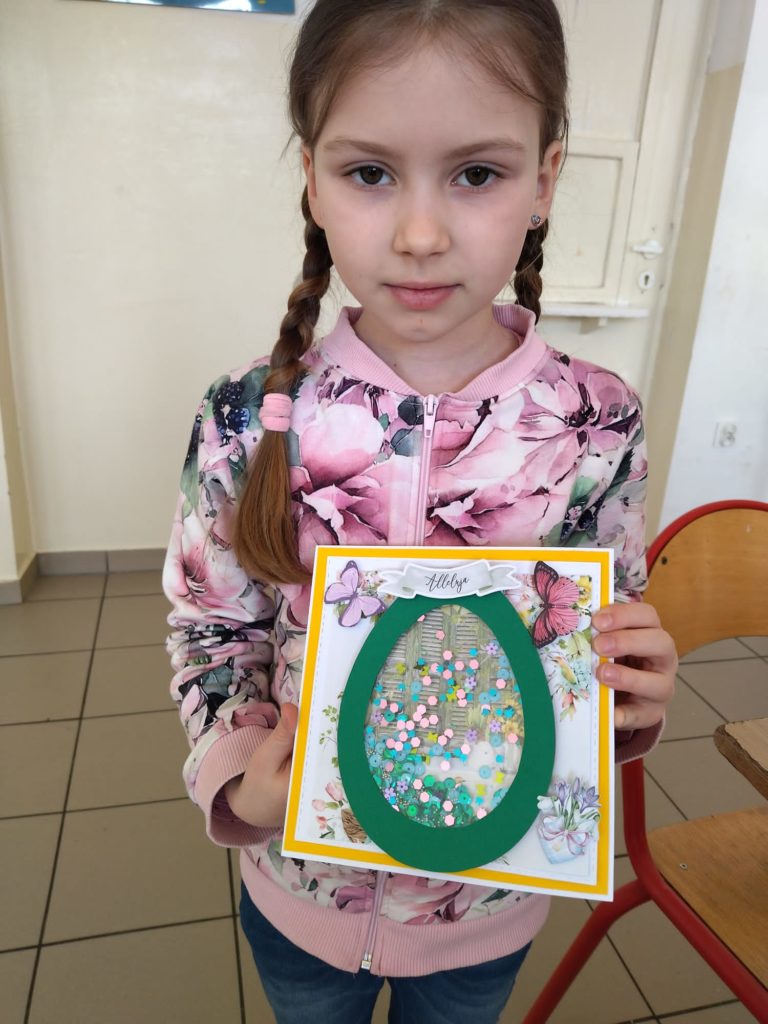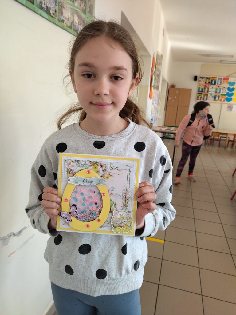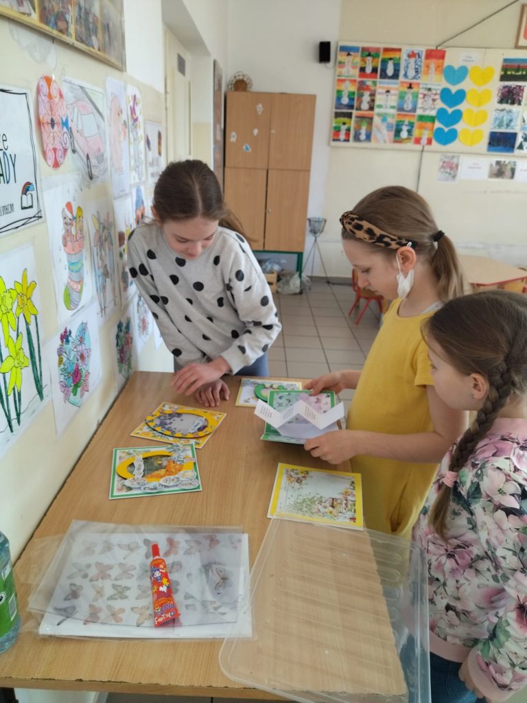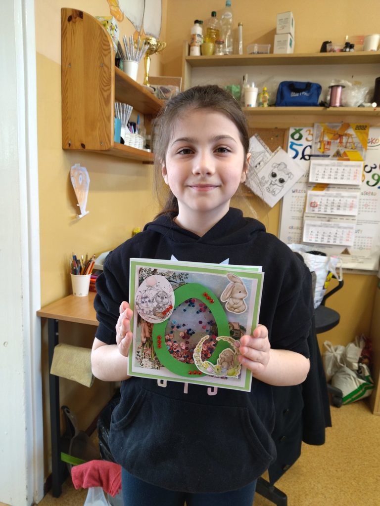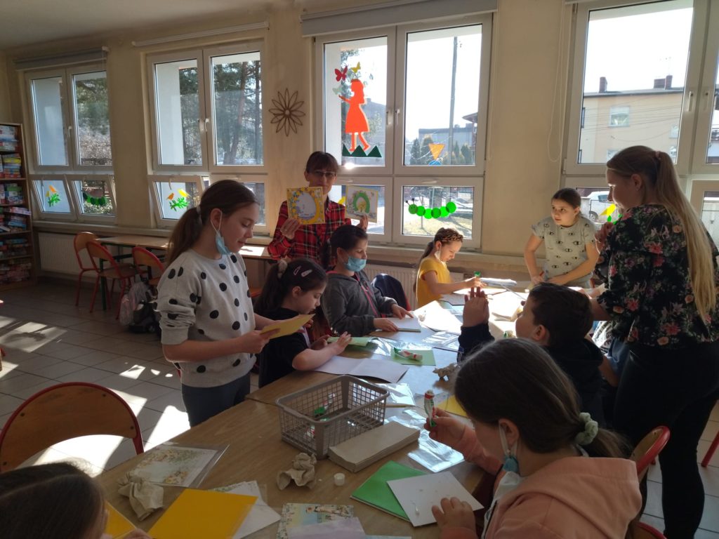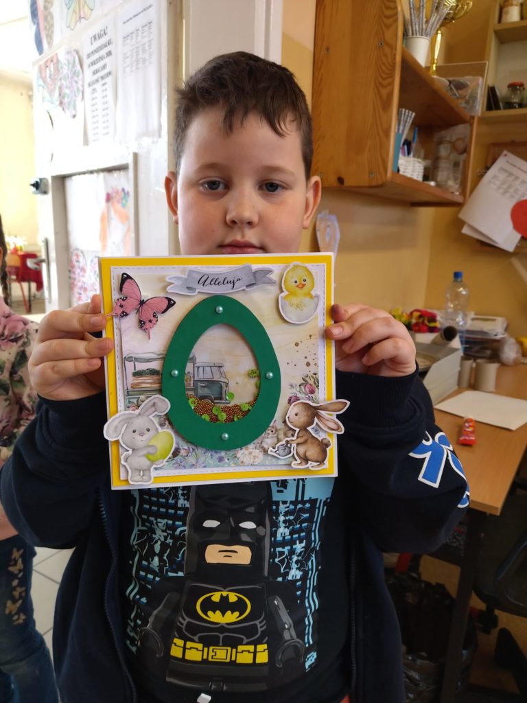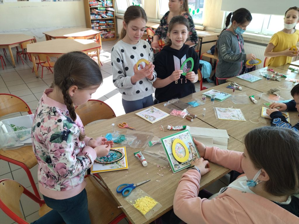 14 marca przybyła do naszej świetlicy Pani Judyta Kęcik na warsztaty o tematyce wielkanocnej. Zadaniem dzieci było wykonanie kartek przestrzennych z użyciem różnych elementów. Najpierw uczniowie dobierali kolorowe papiery, które przyklejali na wyciętą białą grubą kartkę. Potem ją ozdobili elementami wiosny. Następnie na pierwszej stronie przykleili element w kształcie jajka, oddzielili folię i umieścili tam kolorowe, błyszczące ozdoby. Każdy dobierał wg własnego gustu. Potem przykleili folię tak, aby te elementy swobodnie się mogły przesuwać. W środku na kolorową stronę przykleili życzenia świąteczne. Każdy jeszcze ozdobił swoją kartkę świątecznymi elementami wyciętymi z grubego papieru i przykleił piankowymi kostkami, aby efekt był ładniejszy a kartka miała walory przestrzenne. Każda praca była inna i wszystkie były piękne. Dziękujemy pani Judycie za poświęcony czas oraz przekazanie swojej wiedzy i ciekawe materiały. Bardzo dziękujemy również Panu Alfredowi Podolak za zasponsorowanie tych materiałów. Wszystkim życzymy Radosnych Świąt Wielkanocnych.