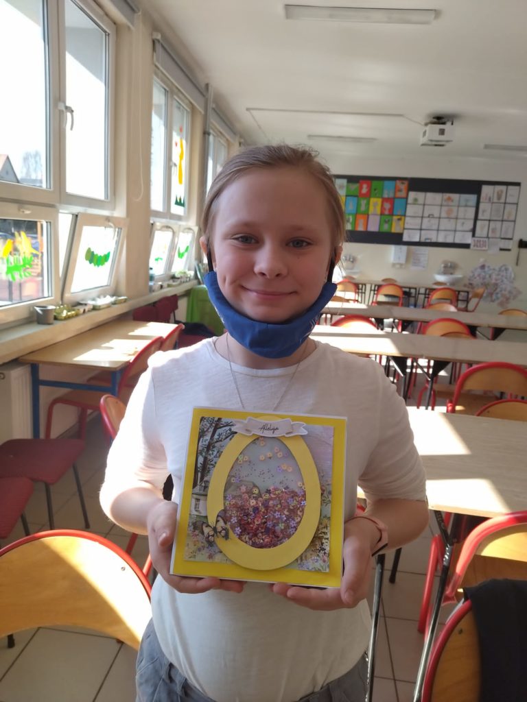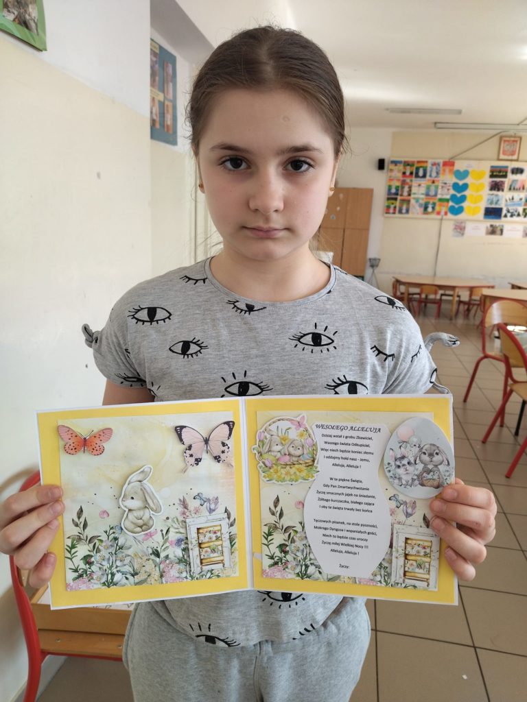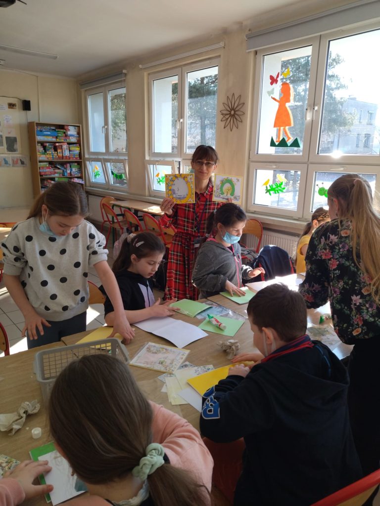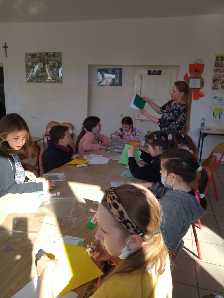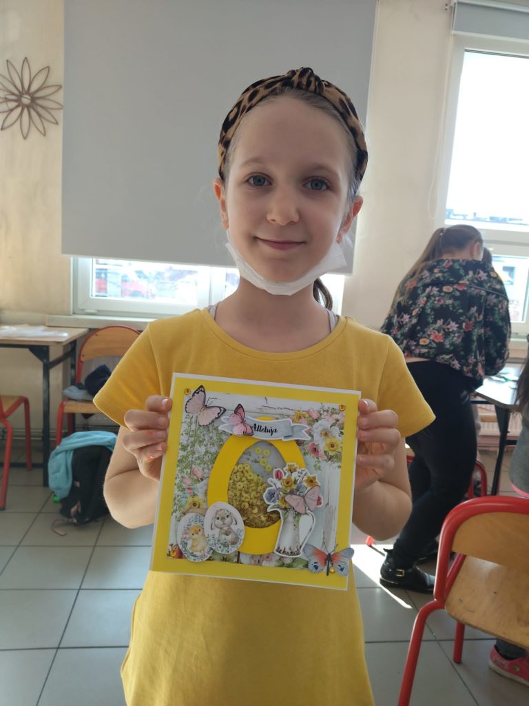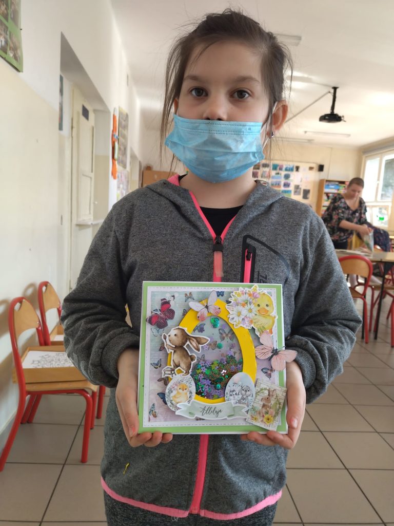 14 marca przybyła do naszej świetlicy Pani Judyta Kęcik na warsztaty o tematyce wielkanocnej. Zadaniem dzieci było wykonanie kartek przestrzennych z użyciem różnych elementów. Najpierw uczniowie dobierali kolorowe papiery, które przyklejali na wyciętą białą grubą kartkę. Potem ją ozdobili elementami wiosny. Następnie na pierwszej stronie przykleili element w kształcie jajka, oddzielili folię i umieścili tam kolorowe, błyszczące ozdoby. Każdy dobierał wg własnego gustu. Potem przykleili folię tak, aby te elementy swobodnie się mogły przesuwać. W środku na kolorową stronę przykleili życzenia świąteczne. Każdy jeszcze ozdobił swoją kartkę świątecznymi elementami wyciętymi z grubego papieru i przykleił piankowymi kostkami, aby efekt był ładniejszy a kartka miała walory przestrzenne. Każda praca była inna i wszystkie były piękne. Dziękujemy pani Judycie za poświęcony czas oraz przekazanie swojej wiedzy i ciekawe materiały. Bardzo dziękujemy również Panu Alfredowi Podolak za zasponsorowanie tych materiałów. Wszystkim życzymy Radosnych Świąt Wielkanocnych.