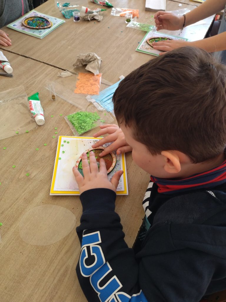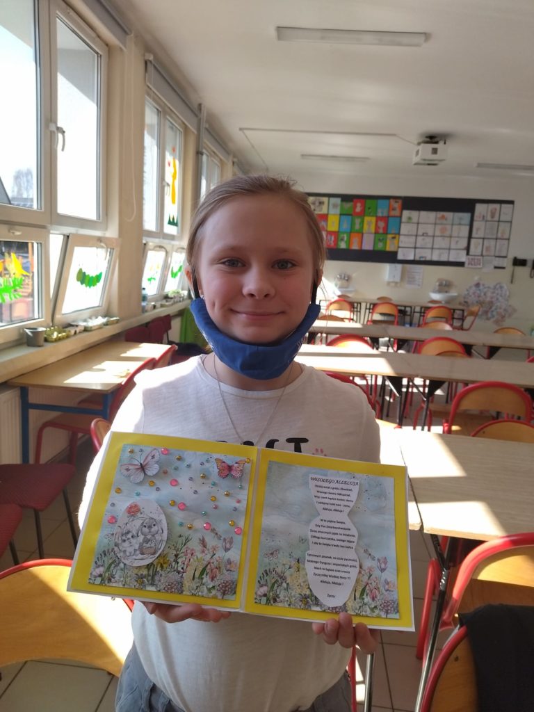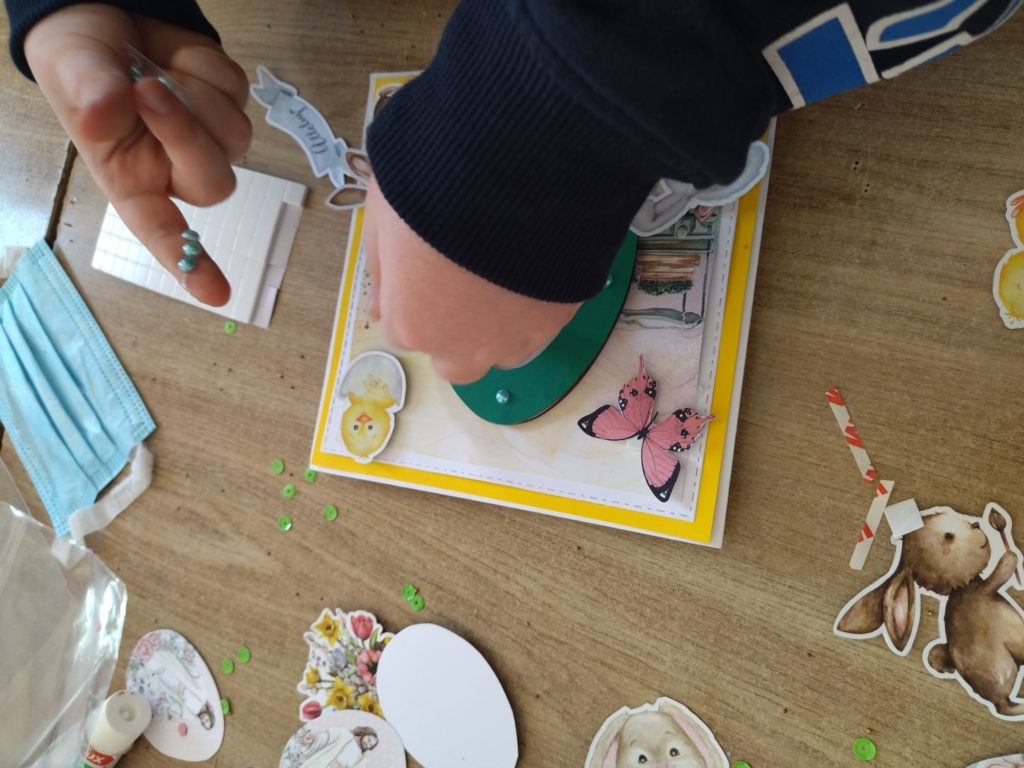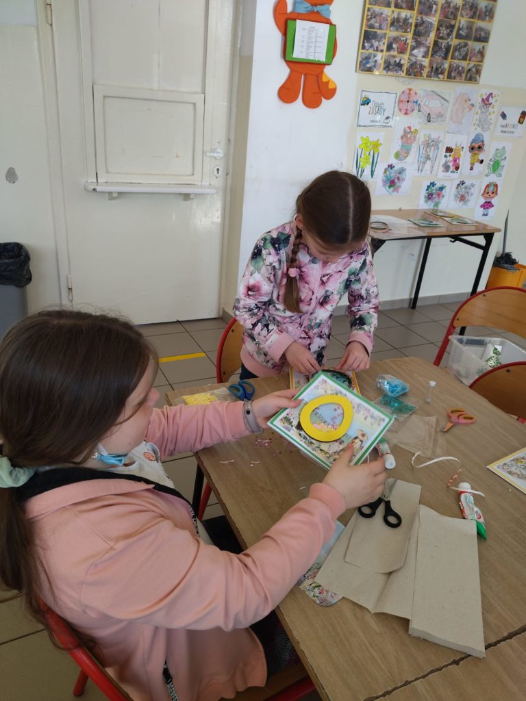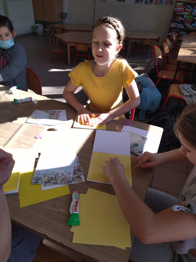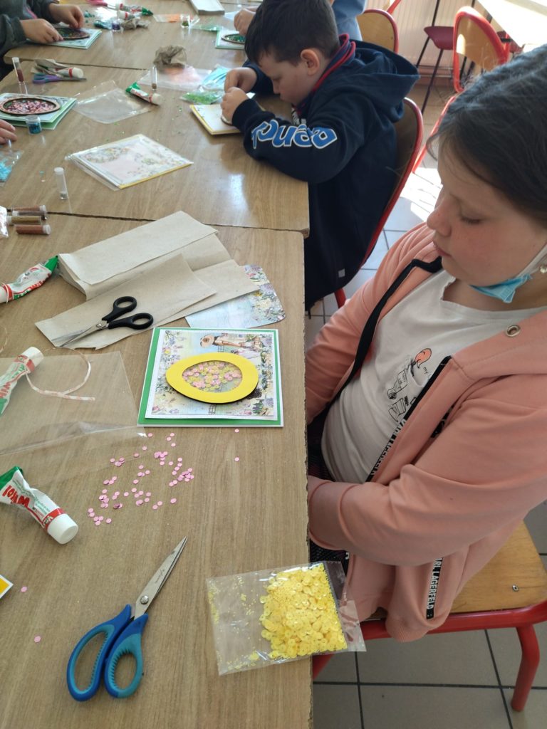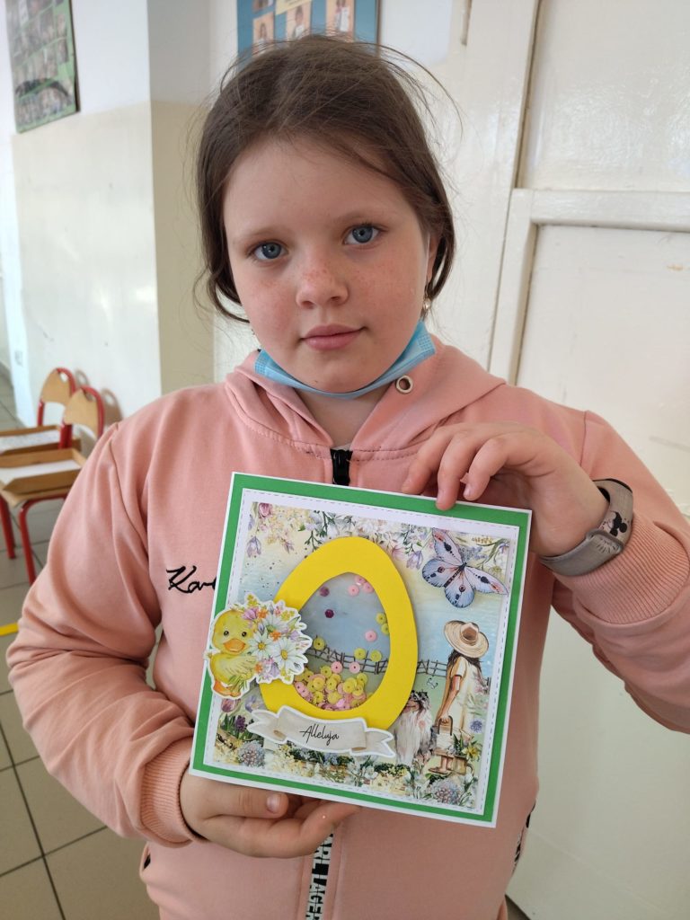14 marca przybyła do naszej świetlicy Pani Judyta Kęcik na warsztaty o tematyce wielkanocnej. Zadaniem dzieci było wykonanie kartek przestrzennych z użyciem różnych elementów. Najpierw uczniowie dobierali kolorowe papiery, które przyklejali na wyciętą białą grubą kartkę. Potem ją ozdobili elementami wiosny. Następnie na pierwszej stronie przykleili element w kształcie jajka, oddzielili folię i umieścili tam kolorowe, błyszczące ozdoby. Każdy dobierał wg własnego gustu. Potem przykleili folię tak, aby te elementy swobodnie się mogły przesuwać. W środku na kolorową stronę przykleili życzenia świąteczne. Każdy jeszcze ozdobił swoją kartkę świątecznymi elementami wyciętymi z grubego papieru i przykleił piankowymi kostkami, aby efekt był ładniejszy a kartka miała walory przestrzenne. Każda praca była inna i wszystkie były piękne. Dziękujemy pani Judycie za poświęcony czas oraz przekazanie swojej wiedzy i ciekawe materiały. Bardzo dziękujemy również Panu Alfredowi Podolak za zasponsorowanie tych materiałów. Wszystkim życzymy Radosnych Świąt Wielkanocnych.