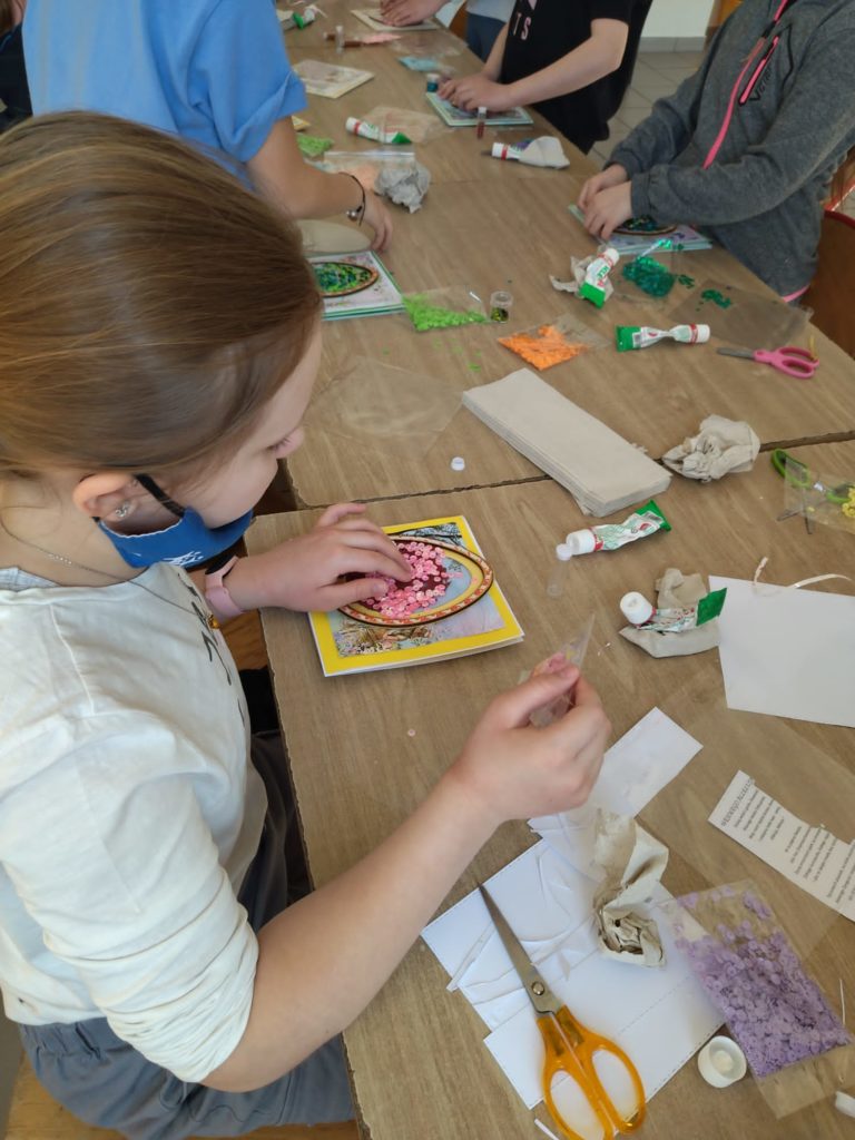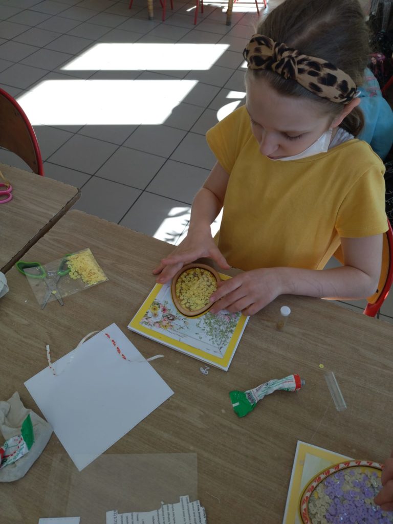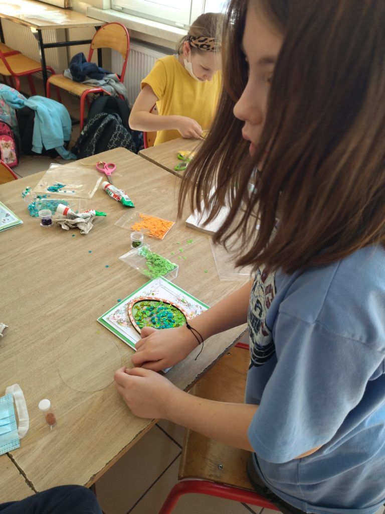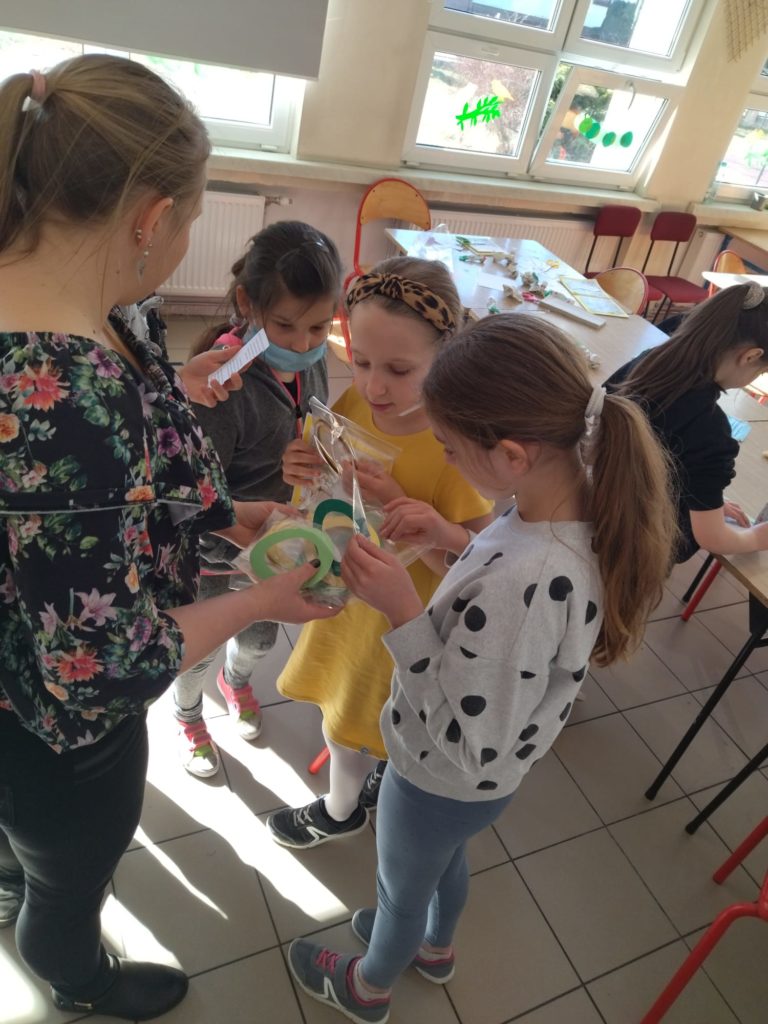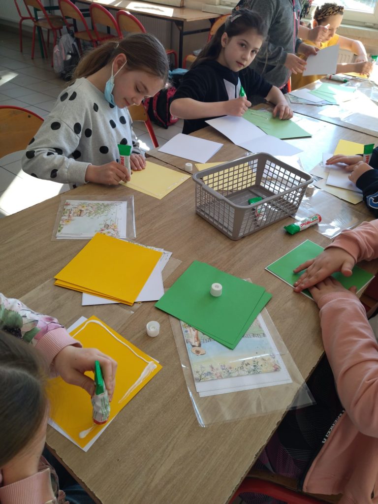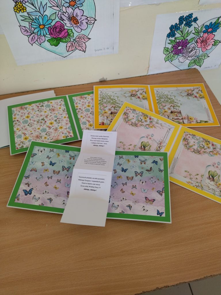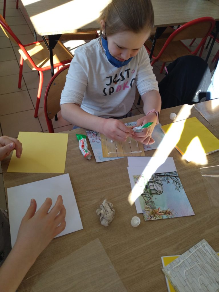 14 marca przybyła do naszej świetlicy Pani Judyta Kęcik na warsztaty o tematyce wielkanocnej. Zadaniem dzieci było wykonanie kartek przestrzennych z użyciem różnych elementów. Najpierw uczniowie dobierali kolorowe papiery, które przyklejali na wyciętą białą grubą kartkę. Potem ją ozdobili elementami wiosny. Następnie na pierwszej stronie przykleili element w kształcie jajka, oddzielili folię i umieścili tam kolorowe, błyszczące ozdoby. Każdy dobierał wg własnego gustu. Potem przykleili folię tak, aby te elementy swobodnie się mogły przesuwać. W środku na kolorową stronę przykleili życzenia świąteczne. Każdy jeszcze ozdobił swoją kartkę świątecznymi elementami wyciętymi z grubego papieru i przykleił piankowymi kostkami, aby efekt był ładniejszy a kartka miała walory przestrzenne. Każda praca była inna i wszystkie były piękne. Dziękujemy pani Judycie za poświęcony czas oraz przekazanie swojej wiedzy i ciekawe materiały. Bardzo dziękujemy również Panu Alfredowi Podolak za zasponsorowanie tych materiałów. Wszystkim życzymy Radosnych Świąt Wielkanocnych.