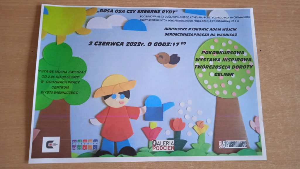 Serdecznie zapraszamy na otwarcie wystawy z XIII Ogólnopolskiego Konkursu Plastycznego „Bosa Osa czy srebrne ryby- inspiracje twórczością Doroty Gellner”. Otwarcie nastąpi 2.06.2022r. o godz. 17.OO w Centrum Wystawienniczym w Pyskowicach Rynek 1. Wystawę będzie można zwiedzać do 30.06.22r. w godzinach pracy Centrum.