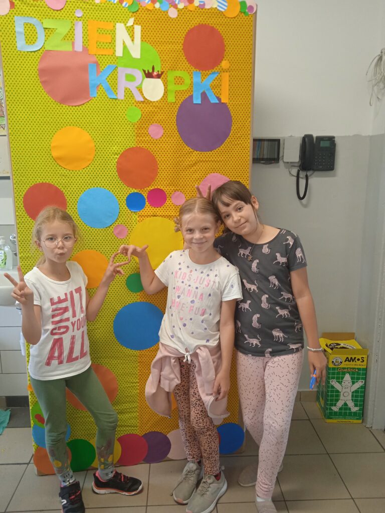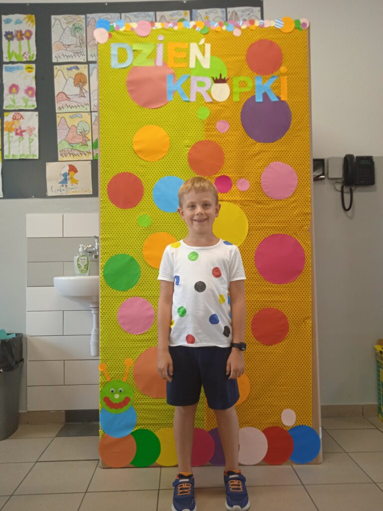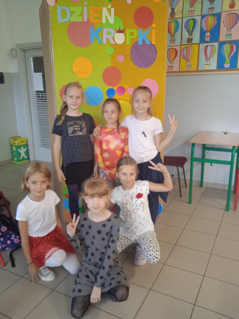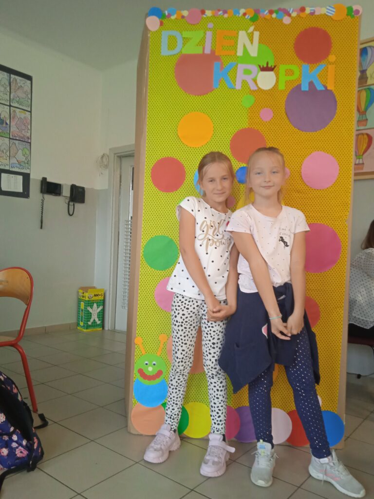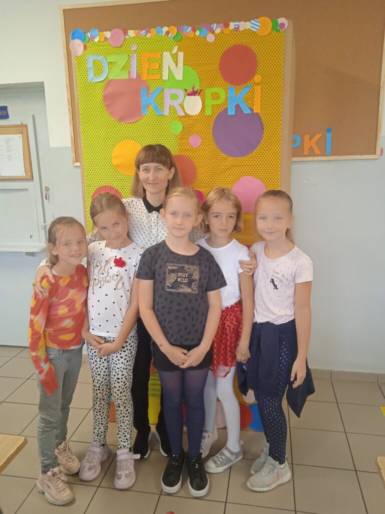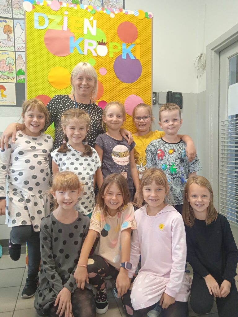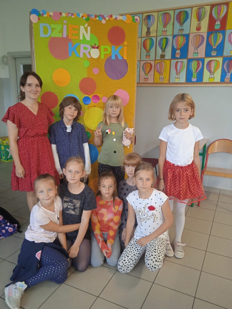 15 września świętowaliśmy w naszej szkole Dzień Kropki. Magia kropki działała wśród najmłodszych uczniów przez cały tydzień. Zaczęliśmy od przeczytania książki Petera Reynolsa „Kropka”. W czasie zajęć uczniowie wykonywali prace plastyczne metodą kropkową, bawili się chustą animacyjną, twisterem, rozwiązywali łamigłówki. Dodatkową atrakcją było stworzenie kropkowej ścianki. Na tle której uczniowie mogli wykonać pamiątkowe zdjęcie. W obchodach tego święta pomogły nam wolontariuszki ze szkolnego koła wolontariatu Mopsik.