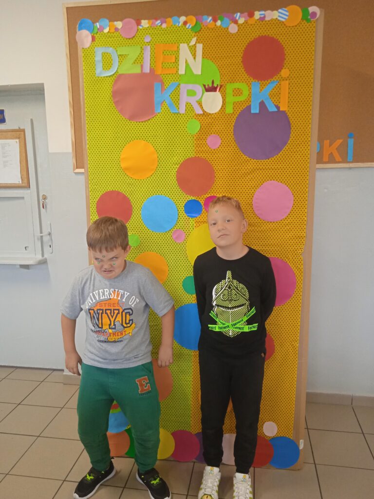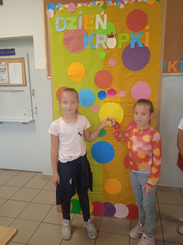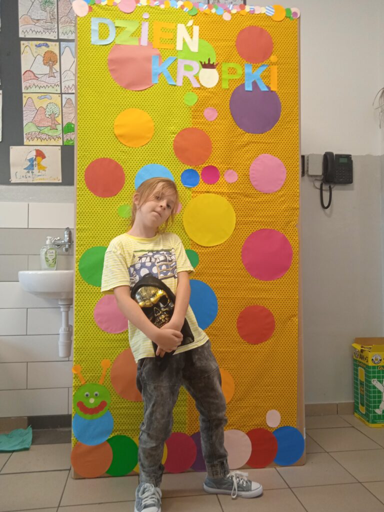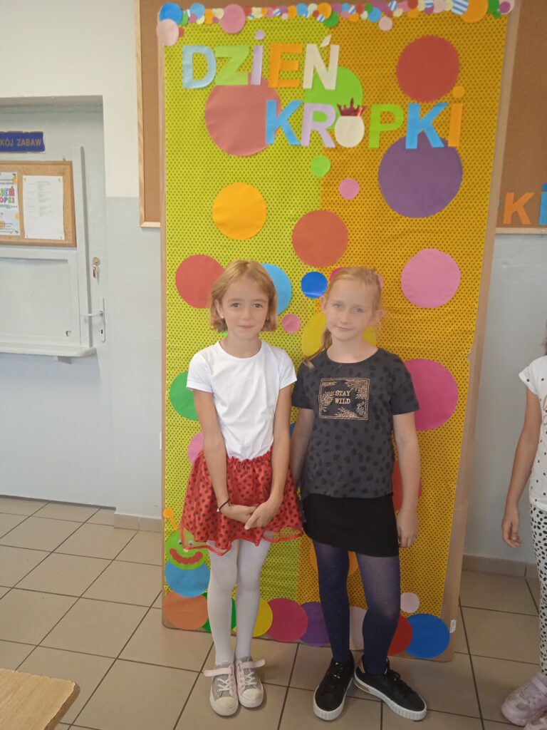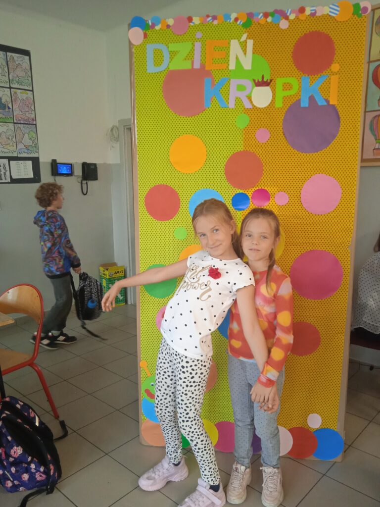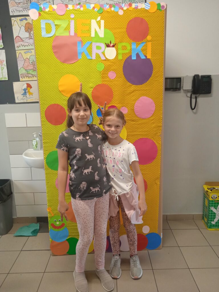 15 września świętowaliśmy w naszej szkole Dzień Kropki. Magia kropki działała wśród najmłodszych uczniów przez cały tydzień. Zaczęliśmy od przeczytania książki Petera Reynolsa „Kropka”. W czasie zajęć uczniowie wykonywali prace plastyczne metodą kropkową, bawili się chustą animacyjną, twisterem, rozwiązywali łamigłówki. Dodatkową atrakcją było stworzenie kropkowej ścianki. Na tle której uczniowie mogli wykonać pamiątkowe zdjęcie. W obchodach tego święta pomogły nam wolontariuszki ze szkolnego koła wolontariatu Mopsik.