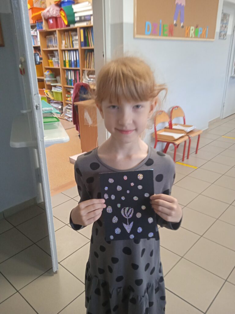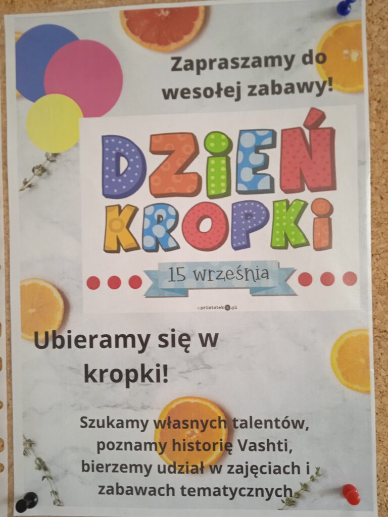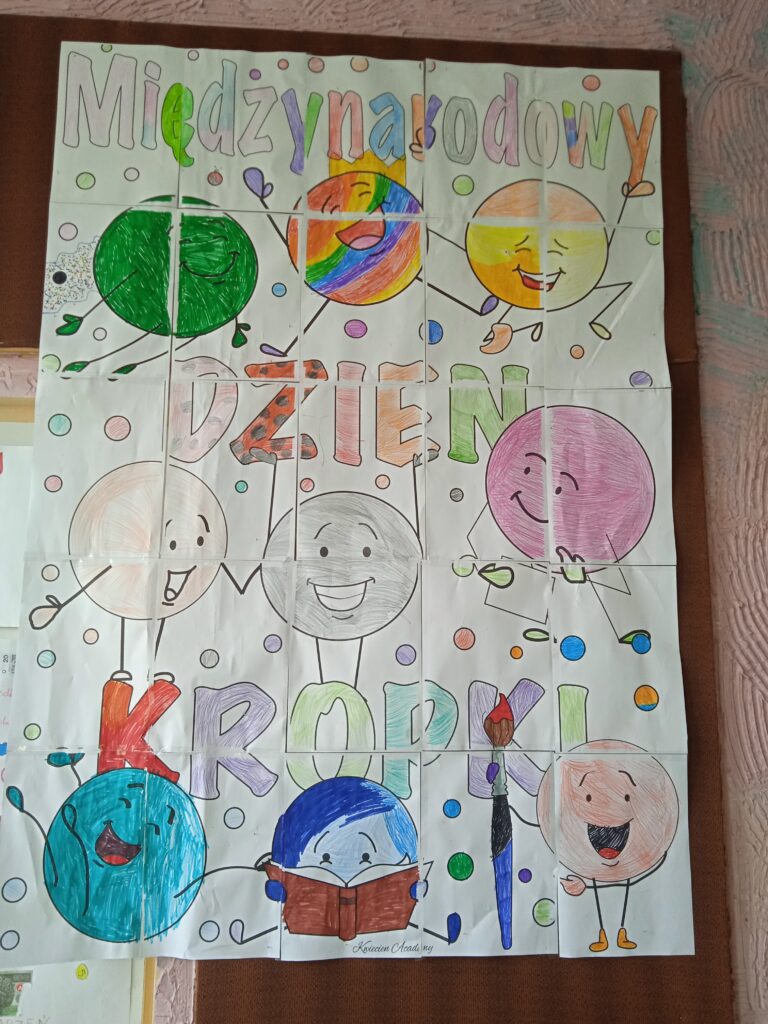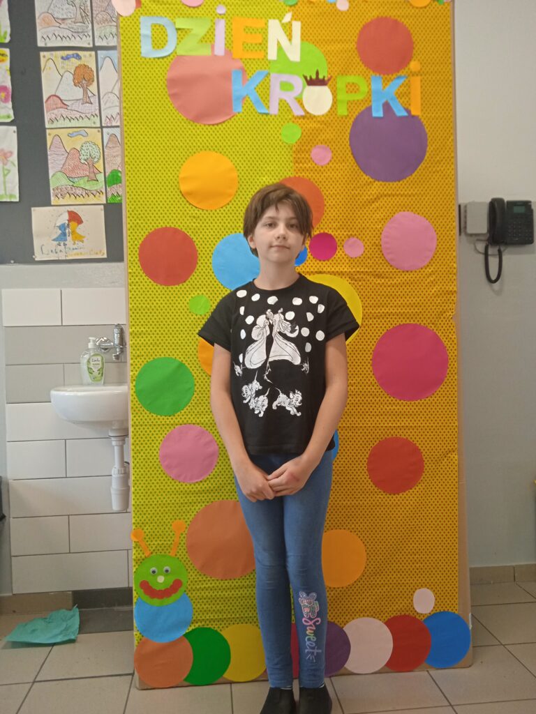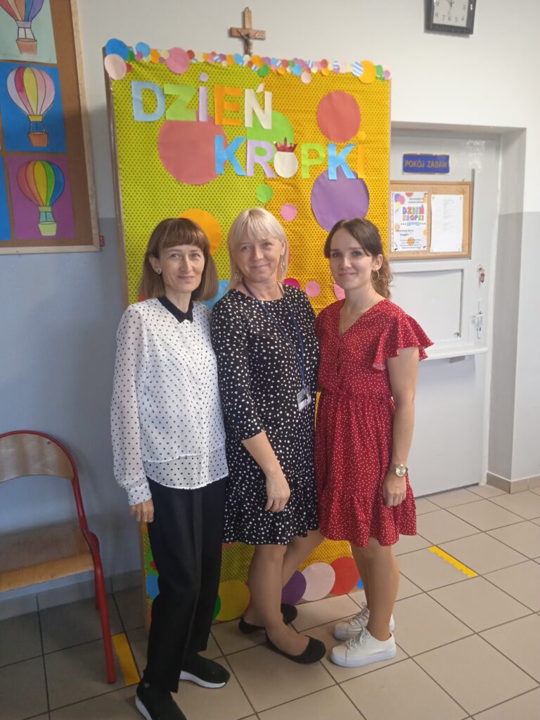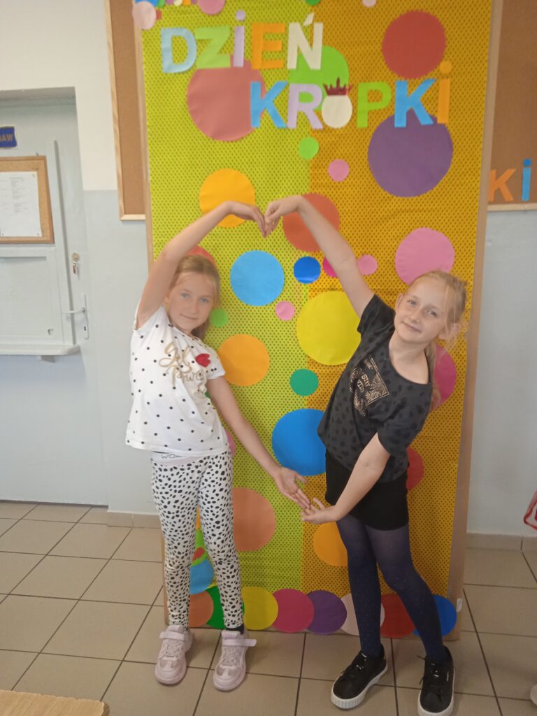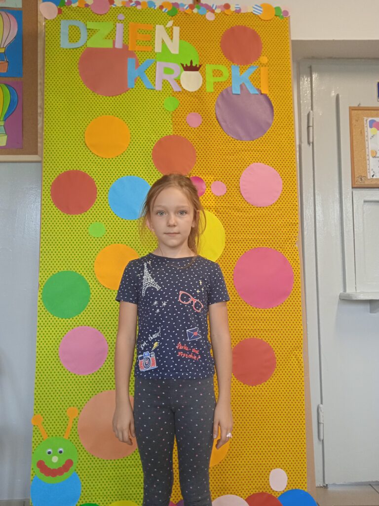 15 września świętowaliśmy w naszej szkole Dzień Kropki. Magia kropki działała wśród najmłodszych uczniów przez cały tydzień. Zaczęliśmy od przeczytania książki Petera Reynolsa „Kropka”. W czasie zajęć uczniowie wykonywali prace plastyczne metodą kropkową, bawili się chustą animacyjną, twisterem, rozwiązywali łamigłówki. Dodatkową atrakcją było stworzenie kropkowej ścianki. Na tle której uczniowie mogli wykonać pamiątkowe zdjęcie. W obchodach tego święta pomogły nam wolontariuszki ze szkolnego koła wolontariatu Mopsik.